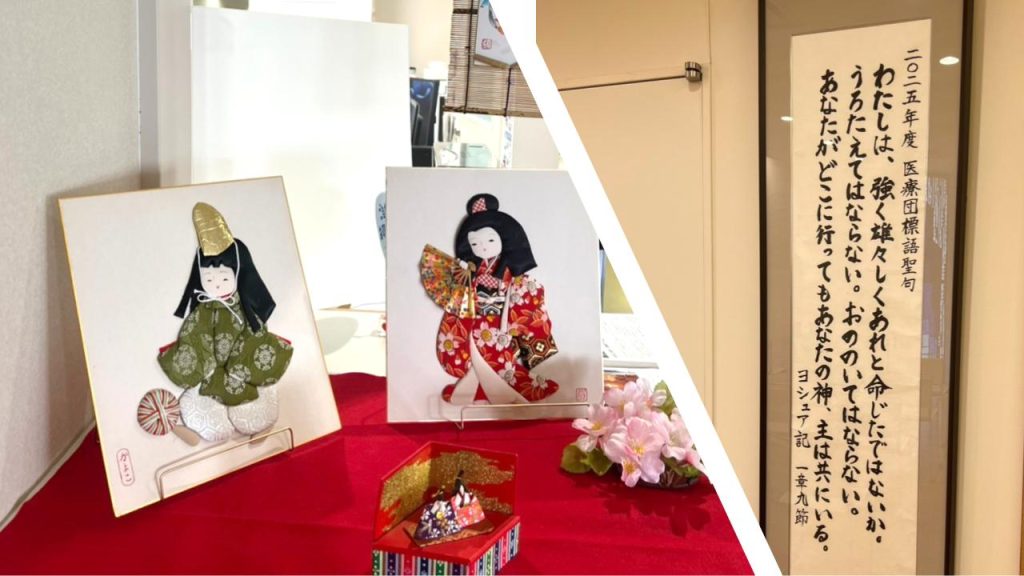 画像:施設の雛飾り(左)、施設の掲示物2025年度医療団標語聖句(右)